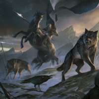 a fantasy scene with several animals, including wolves and crows. In the center, there is a figure riding on horseback, facing towards the viewer but looking away from the camera. The background features