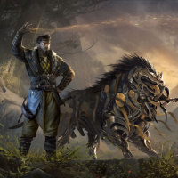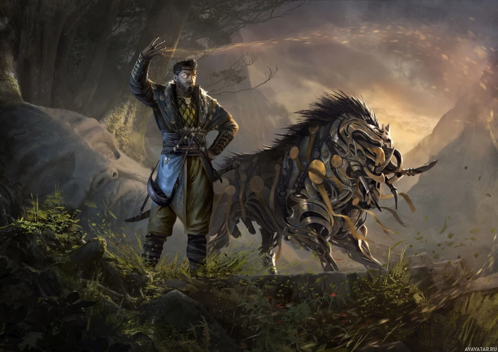 magical abilities. On the right side of the image, there's a creature that has both wolf-like and fantasy elements. It has long spikes on its back and shoulders, giving it an intimidating appearance, but also appears to be tamed or under control by the man. The setting is lush with greenery and trees, which adds to