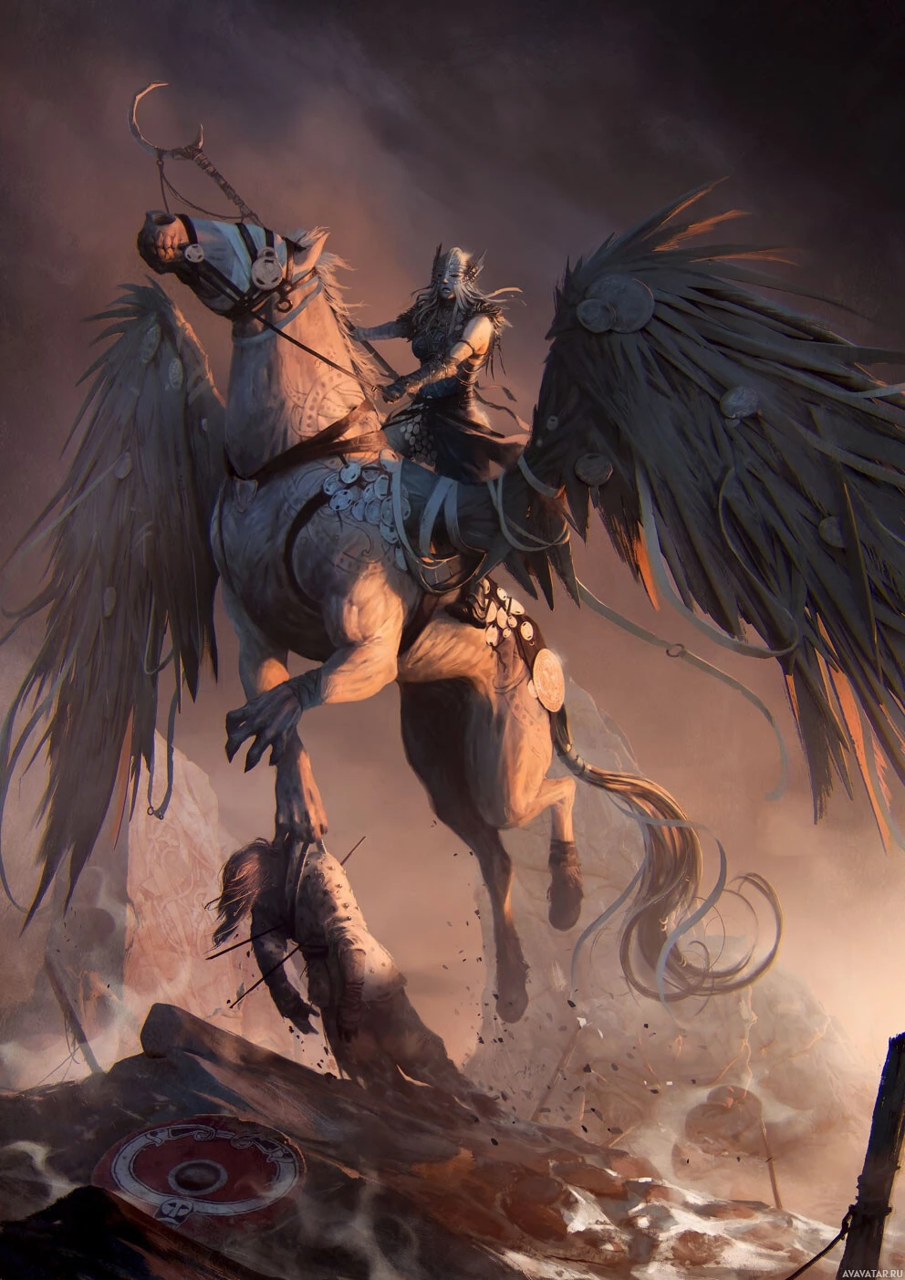 a fantasy scene with a rider sitting atop a pegasus, which is a mythical creature that resembles a horse but has wings. The rider appears to be
