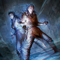 a fantasy scene with two characters. One character appears to be an older, possibly male wizard or mage, dressed in robes and holding a staff or wand that emits