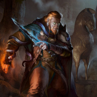 a fantasy scene with a man dressed in what appears to be medieval or fantasy-inspired attire. He has a long, braided beard and is holding a sword in his right hand. Behind him are two horses, one closer than the other, and there's a magical or mystical vibe due to the misty background and the man's