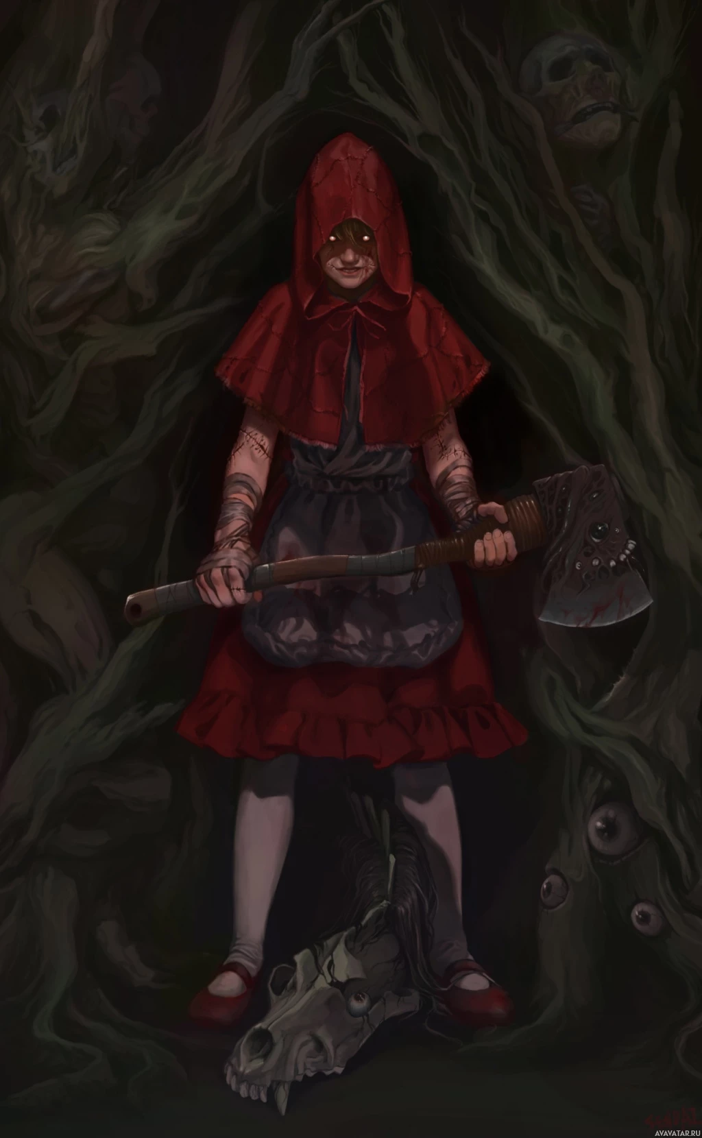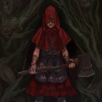 a young girl dressed in a costume with elements resembling Little Red Riding Hood. She is holding an axe, and there are various forest-like creatures around her that appear to be inspired by fairy tales or