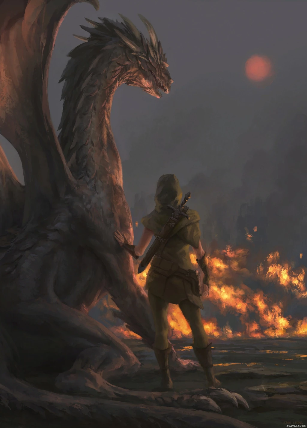 a fantasy scene featuring a person standing in front of a dragon. The individual appears to be holding a sword, suggesting they are engaged in combat or preparing for it. The setting seems to be outdoors at dusk or dawn, as indicated by
