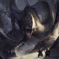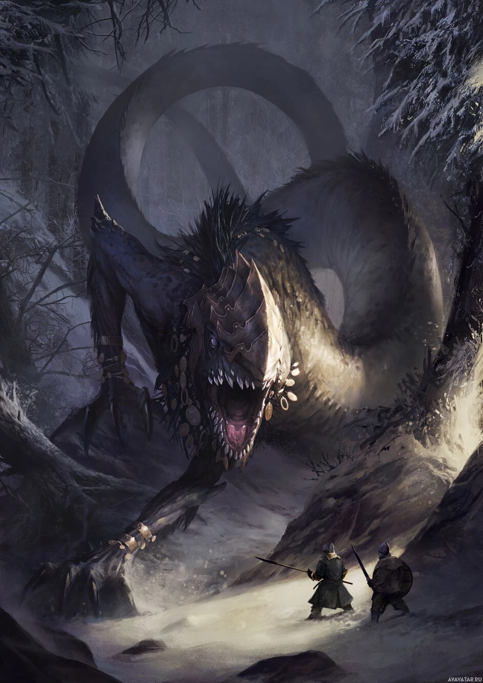 a cold environment. There are two figures on either side of the monster; one is holding what looks like a staff or wand, while the other appears to be an adventurer equipped with armor and a sword.