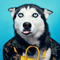 blue eyes and thick double coat. The dog is posed to look like it's wearing a patterned shirt with
