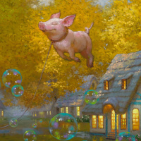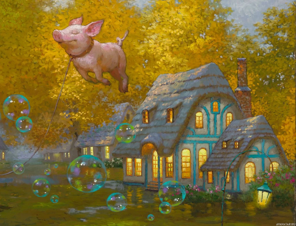 a whimsical scene with a flying pig. In the foreground, there are bubbles floating in the air, adding to