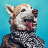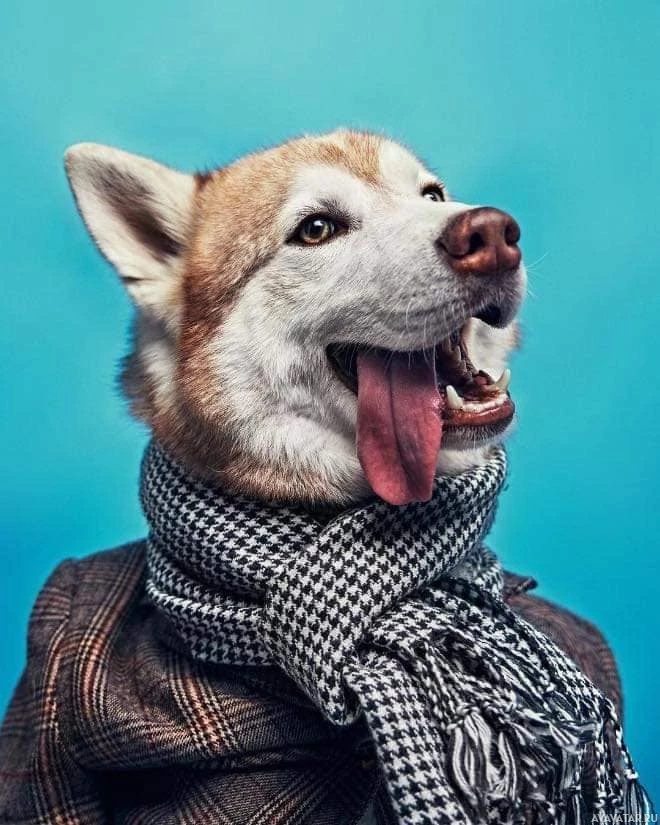 a husky breed. The dog is wearing a scarf around its neck and appears to be dressed up in clothes that resemble