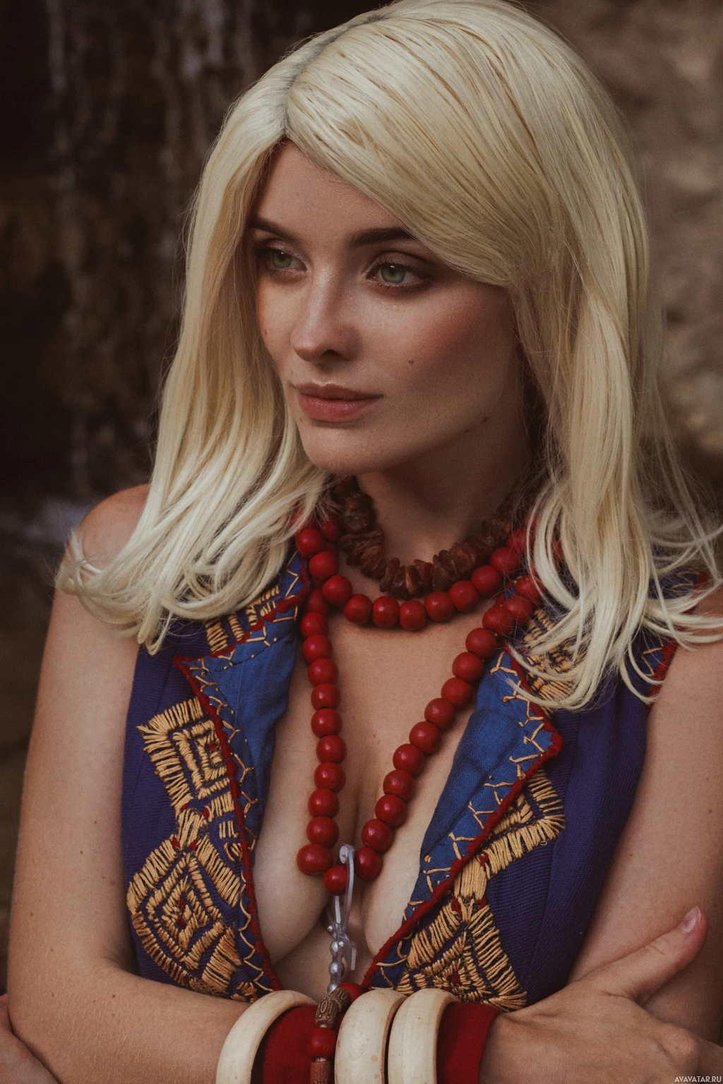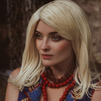 The image features a woman with blonde hair, wearing makeup and an outfit that appears to be inspired by the character Keira Metz from