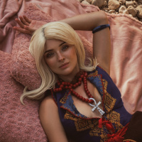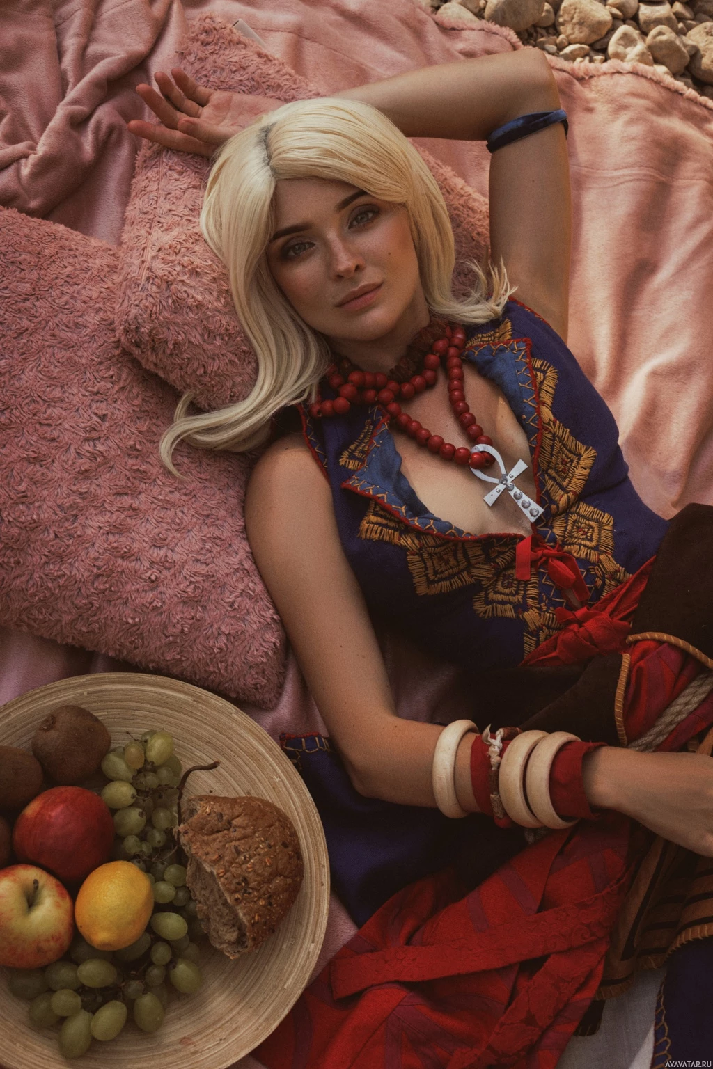 The image shows a woman lying on a pink blanket outdoors, wearing a fantasy-themed costume that resembles the attire of Ciri from "The Witcher"