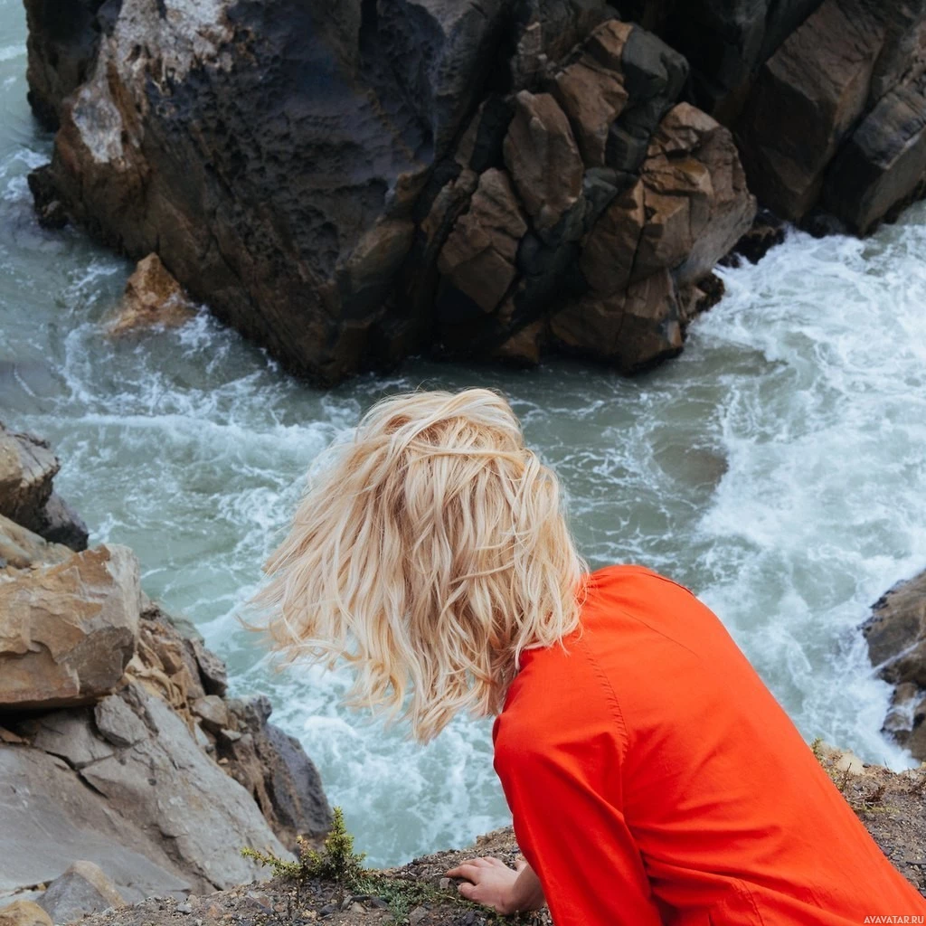 blonde hair, standing on what appears to be a rocky coastline. She is looking down towards the water below, which has