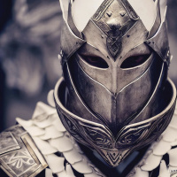 The image shows a person wearing armor with a face mask that covers the entire head, which is reminiscent of historical warriors or