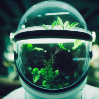 an astronaut suit, with the helmet off and the visor down. Inside the helmet, there is a potted plant with
