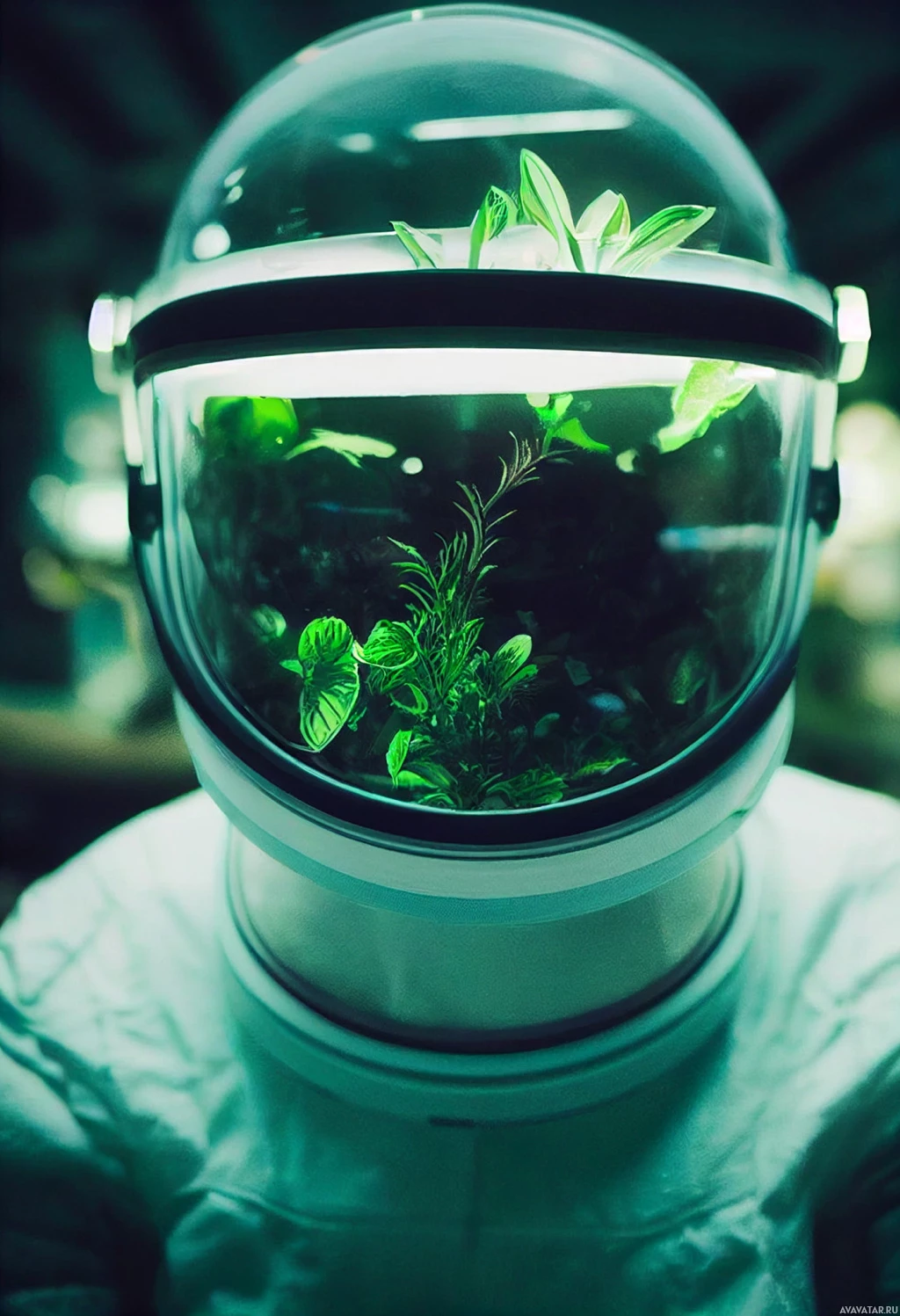 space exploration attire with the maintenance and growth of plants, which is not typically associated with astronauts in their professional roles. The background is blurred but appears to be