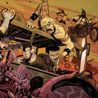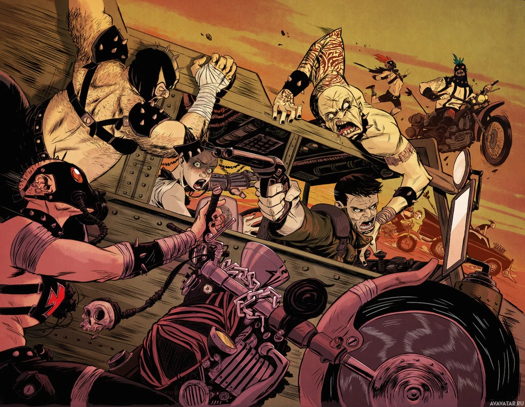 a chaotic scene with several characters that appear to be from the Mad Max movie series. In the foreground, there is a car that has been heavily modified, which is characteristic of the film's