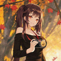 autumn leaves in the background, indicating a seasonal setting. Her expression is cheerful as she smiles at the viewer. The overall scene conveys a casual, relaxed atmosphere with a touch of