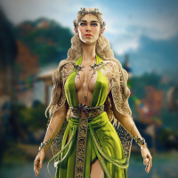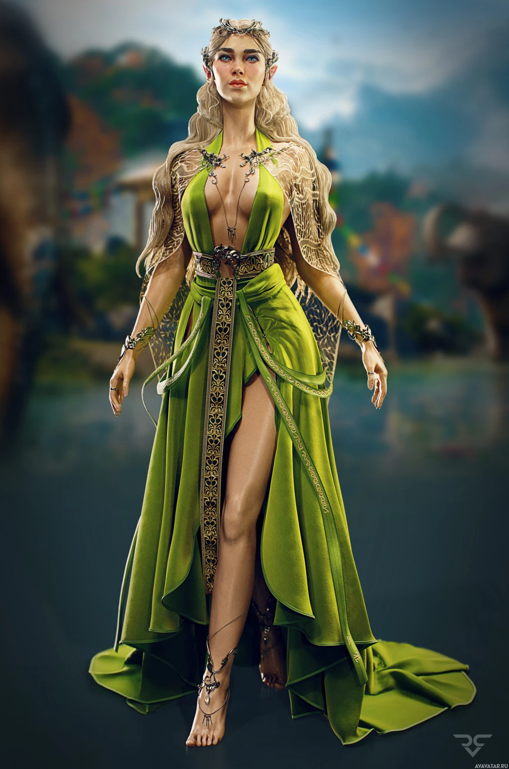 green dress with intricate detailing, suggesting a magical or mystical nature typical of such elven attire in fantasy lore. The setting appears to be outdoors with natural elements like trees and foliage in the background, indicating a serene and possibly enchanted environment.