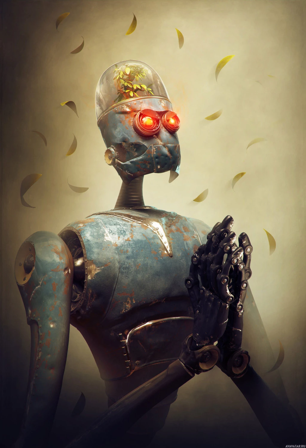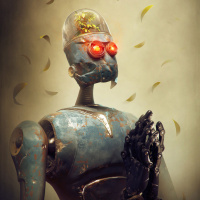 mechanical parts, including what appears to be a torso with various metallic components and joints. On the head, there is a pair of glowing