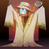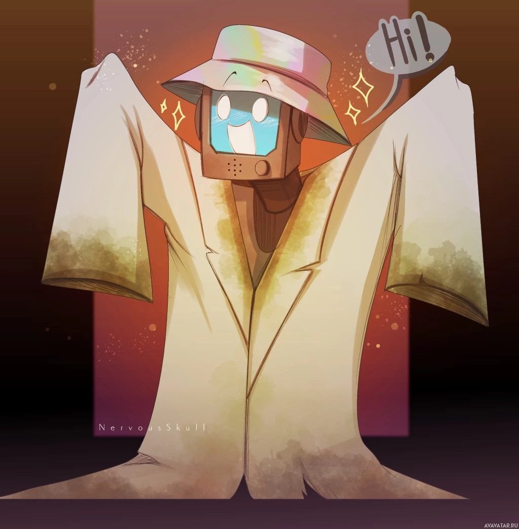 an animated character that appears to be a robot. It's wearing a raincoat or poncho, and there are sparkles around it, which could suggest excitement or happiness. The character is in a cheerful
