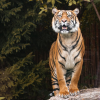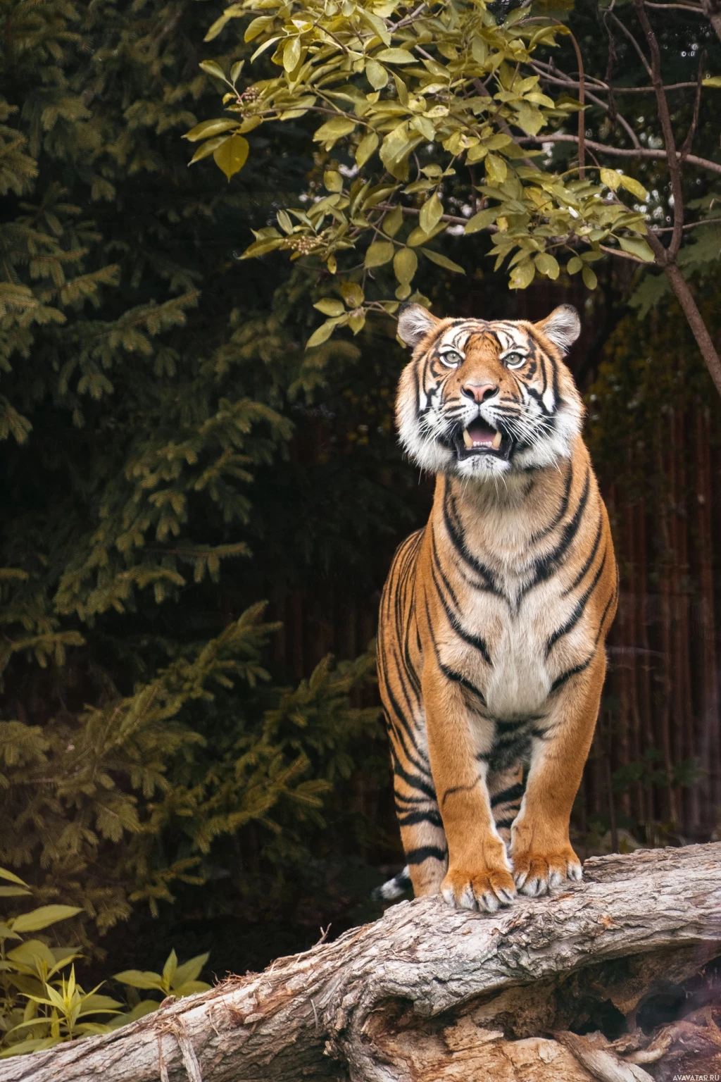 The image features a tiger sitting atop what appears to be a tree stump or log in