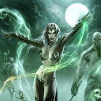 skeletal remains, suggesting a supernatural or gothic theme. She is holding out her hands, possibly casting a spell or controlling the spirits around her. The overall atmosphere of the image suggests a scene from a horror story or fantasy game, where magic and the supernatural are central themes.