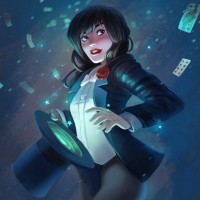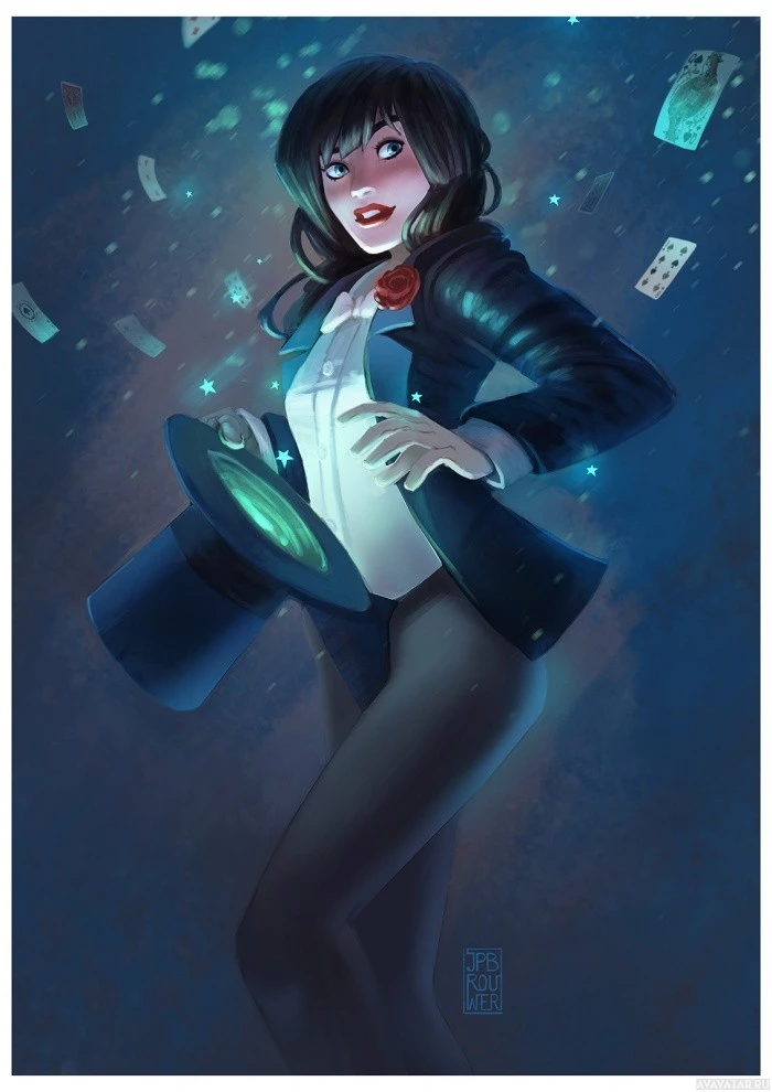 a female character. She is styled in a manner reminiscent of Zatanna, who is a fictional superheroine appearing in American