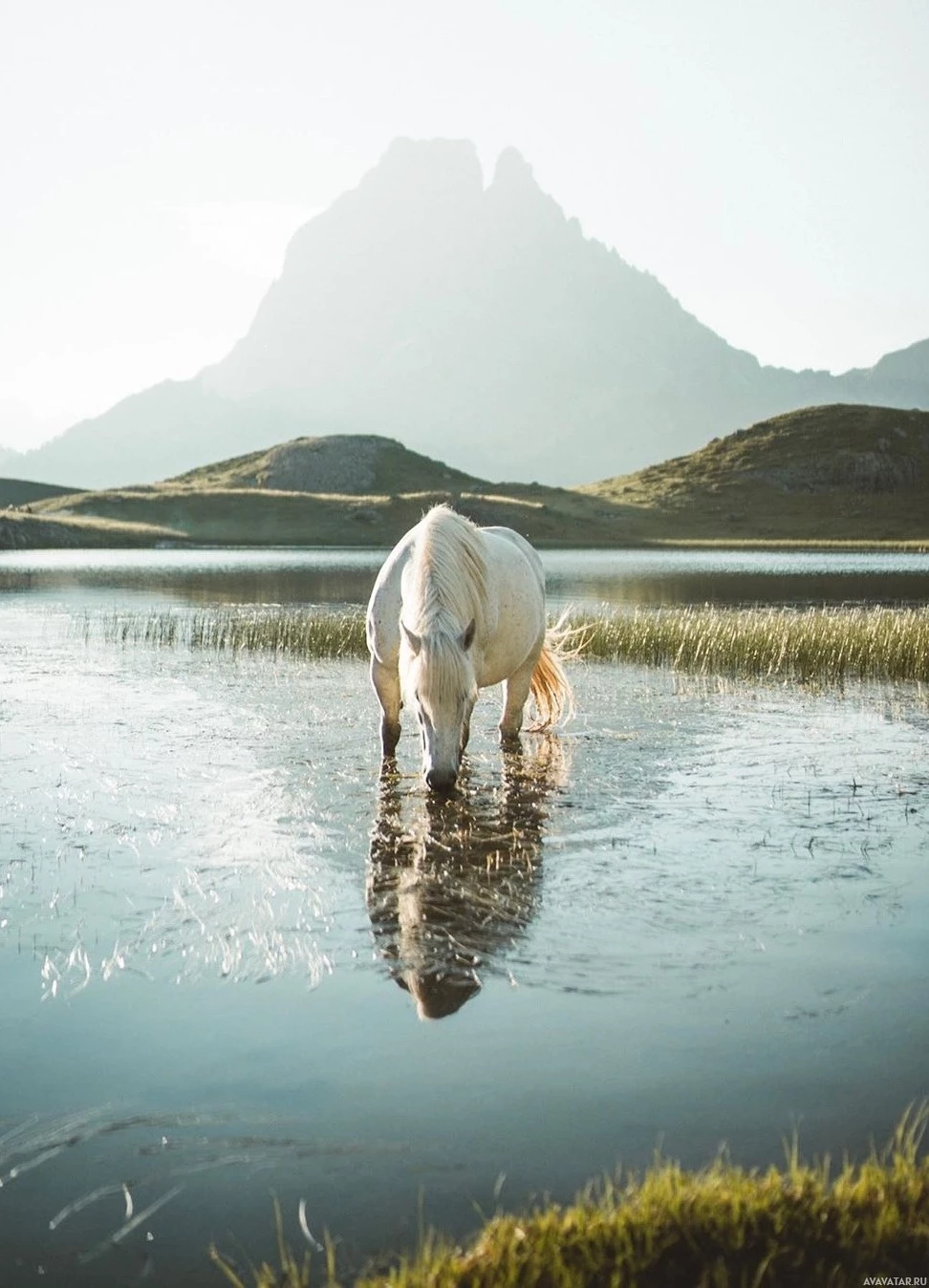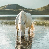 shallow water, possibly drinking or wading, with its reflection visible on the water's surface. Behind the horse are