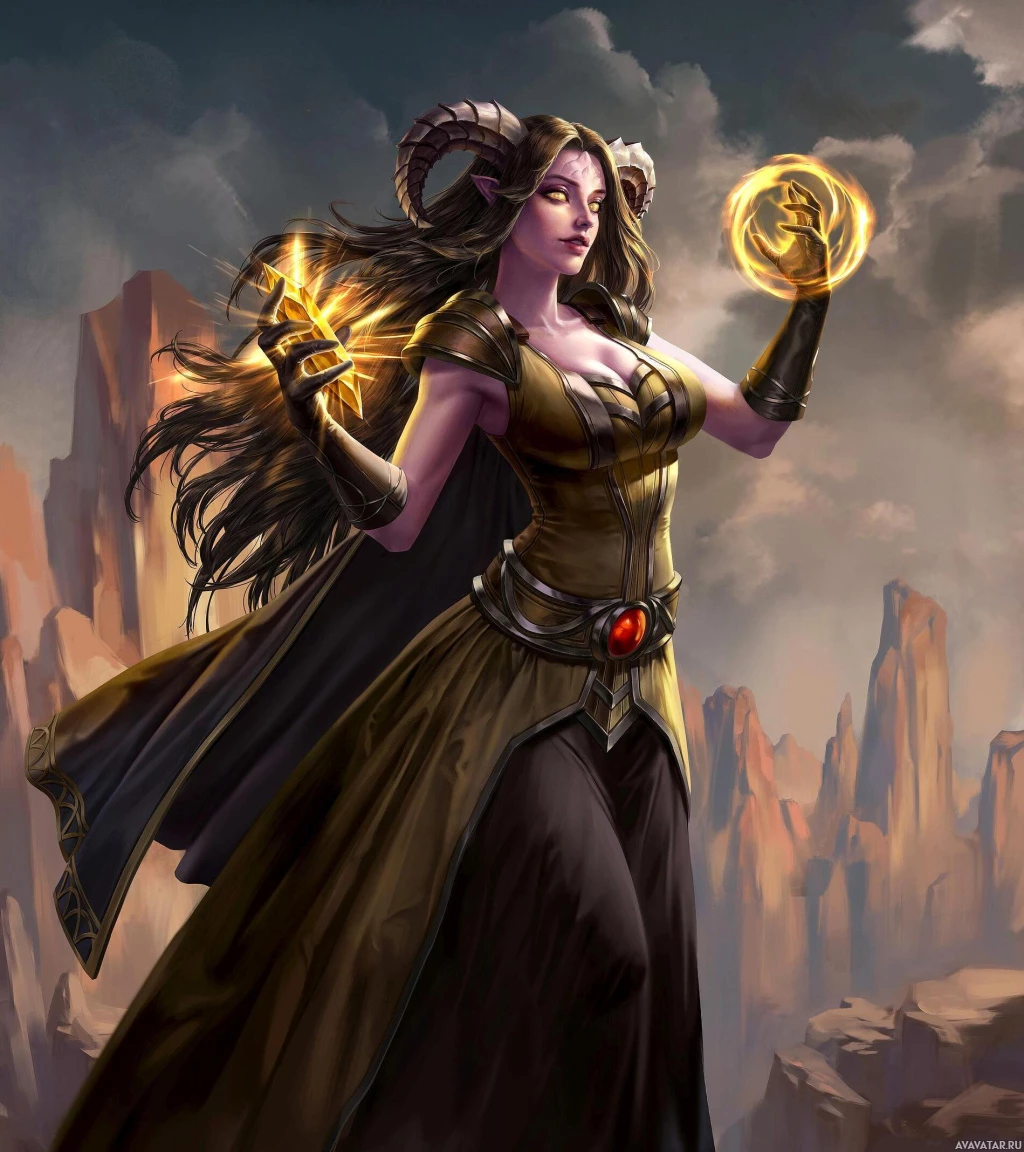 The image depicts a character with horns and a staff, who appears to be from the fantasy universe. She is dressed in armor and holding what looks like magical orbs. This character could be associated with the draenei race within the context of the fantasy universe.