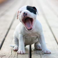 a small dog with its mouth open, possibly making a noise like barking or yelping. The dog appears to be on