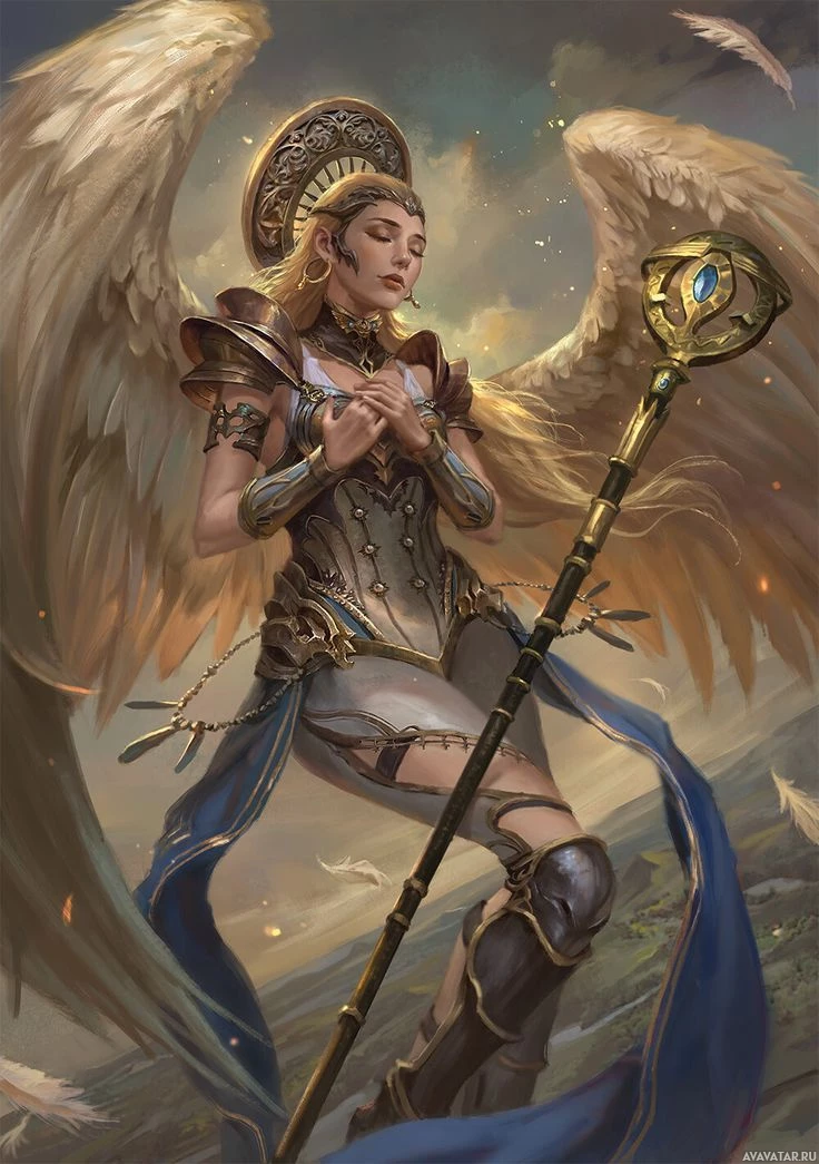 large wings, closed eyes, and is wearing armor with wings attached to it. They are holding what looks like a staff or wand. The background suggests a mystical or enchanted setting, which is common in fantasy artwork.