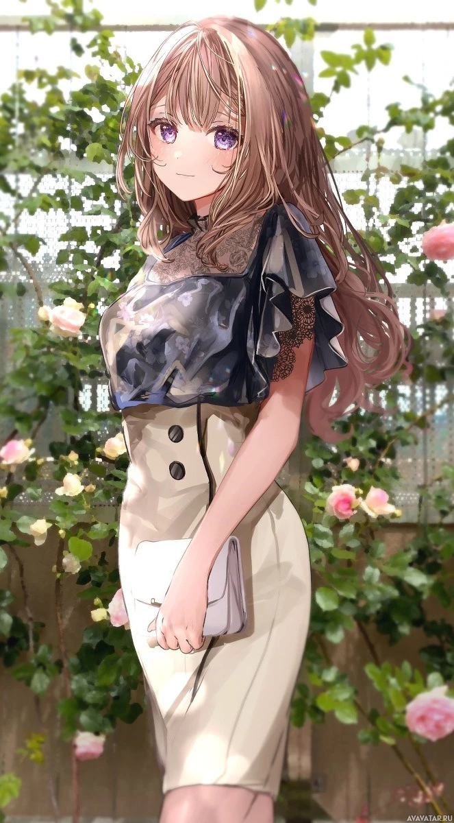 На картинке изображен анимационный персонаж, девушка со светлыми волосами, одетая во что-то похожее на голубое платье или нарядную одежду. Она стоит в саду, окруженная цветами, что наводит на мысль о том, что сейчас весна или лето.