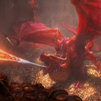 the first dragon. The background suggests a fiery battlefield with a dark and