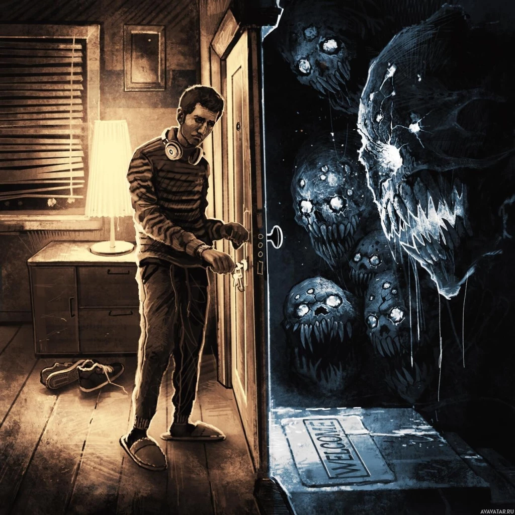 the doorway of a room, holding a key. He appears to be looking at something or someone behind him. On the other side of the open door, there are several grotesque, monstrous creatures with
