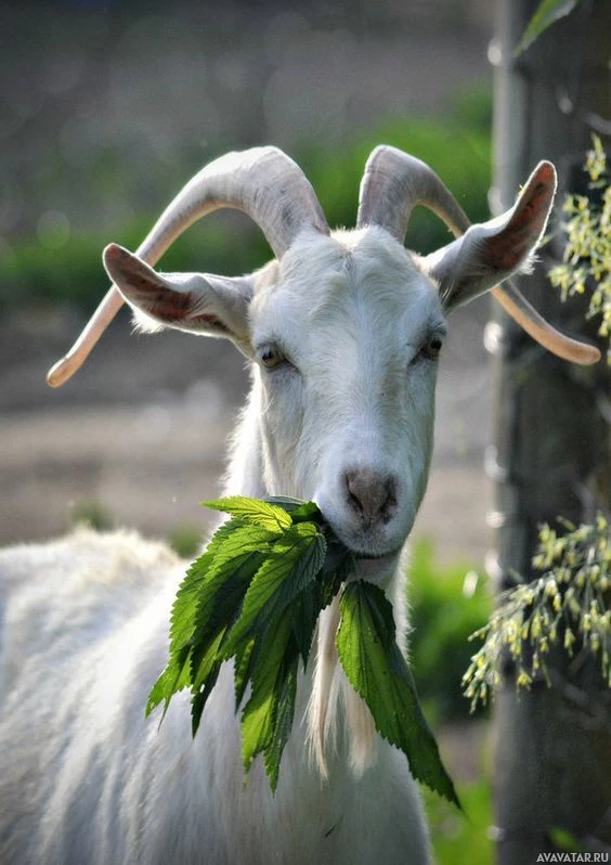 На картинке изображен козел с выступающими рогами, который, похоже, поедает какую-то зеленую растительность. Козы известны своей способностью поедать различные растительные материалы, включая траву, листья и кустарники.