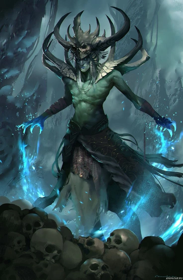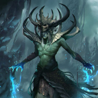 a fantasy character, which could be described as an eldritch entity or an otherworldly being. The character has antlers and appears to have a malevolent or mystical presence. The artwork features dark colors with accents of blue light emanating from the character's hand, suggesting magical or