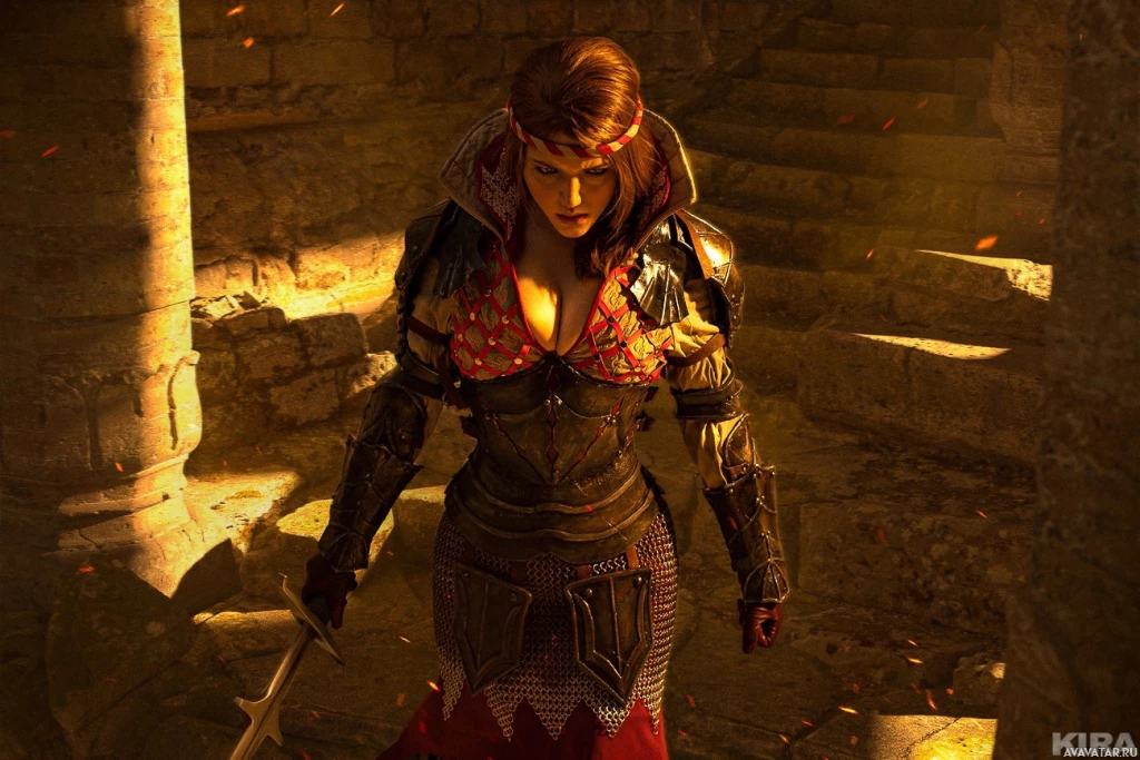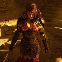 signature swords. The setting looks like an ancient or medieval ruin, which aligns with the aesthetic and fantasy themes common in "The Witcher" series.