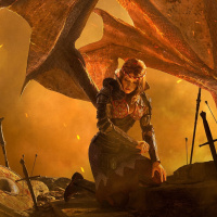 the video game "The Witcher 3: Wild Hunt." The character is kneeling in front of a dragon that has its wings spread. The setting appears to be a desolate, battle-