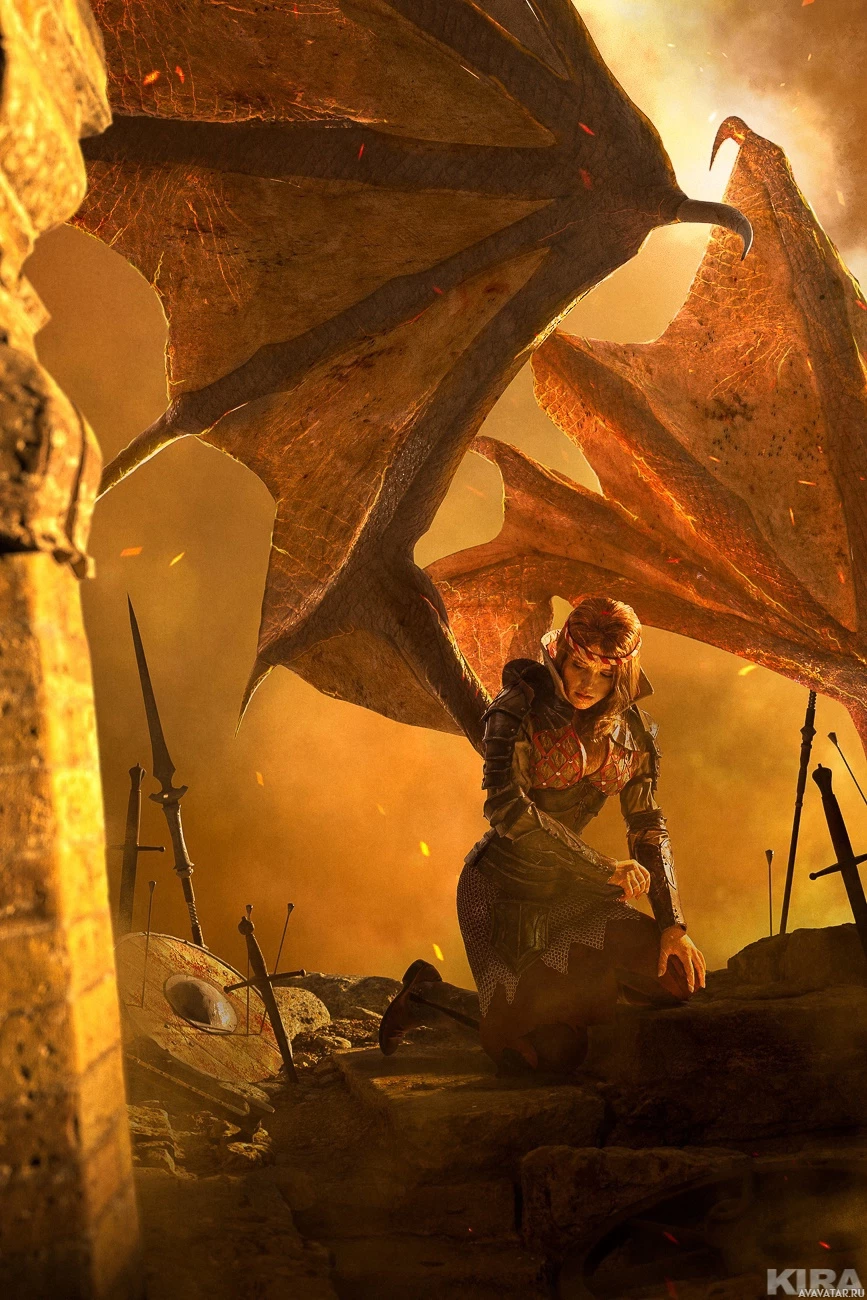 torn landscape with destroyed structures and debris around them. The character is wearing armor, suggesting she may be a warrior or a knight. There are also swords visible in the scene, indicating combat or battle elements within the game.