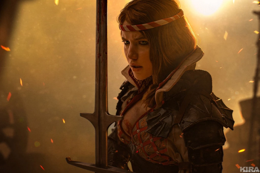the video game series "The Witcher." The character is dressed in armor and holding a sword, indicating that she might be involved in combat or action within the game. Her expression is focused, suggesting she is ready for battle or is preparing to engage in some