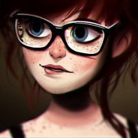 red hair with freckles, wears glasses, and has a somewhat surprised or intrigued expression on her face. Her attire is casual, with what seems to be