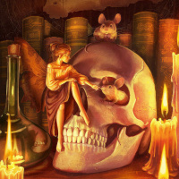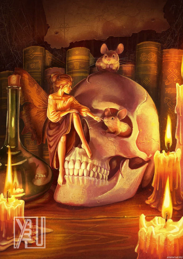 a large skull on which sits a mouse. To the left of the skull, there's a figure that appears to be a fairy or
