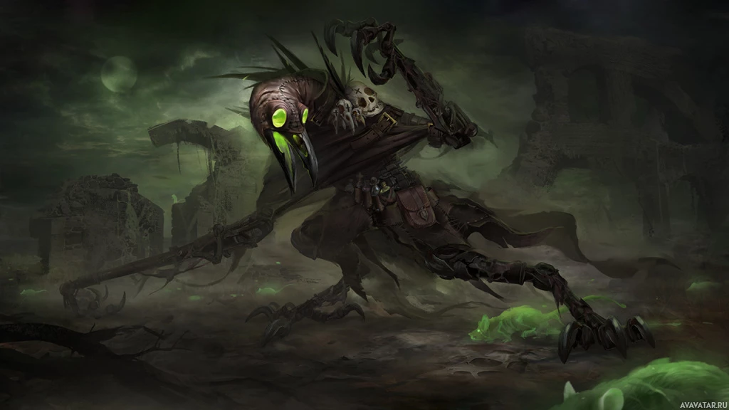 glowing eyes. The creature is standing in a desolate landscape with a dark sky, suggesting it might be from a dark
