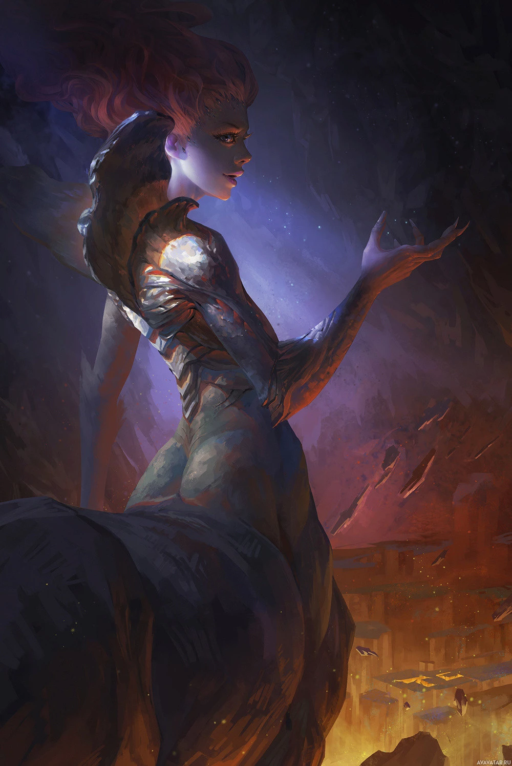 a dramatic pose, possibly at the edge of a cliff or overlooking a fiery landscape below. The colors are vibrant with a dominance of blues, purples, and reds, contributing to
