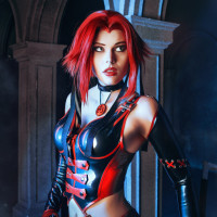 red bodysuit with a fantasy-inspired design, complete with spikes and armor elements. She has long