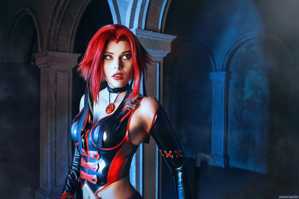 a female character in a stylized setting that appears to be inspired by the "BloodRayne" series, which is known for its video game content. The character is dressed in a black and