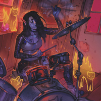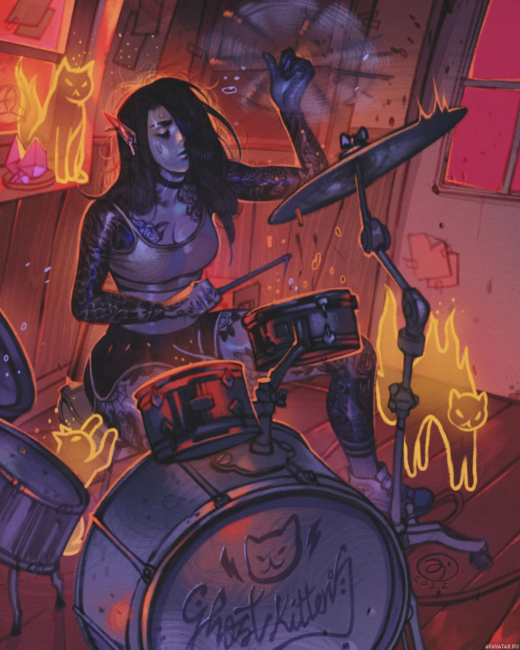 an animated character who appears to be an elf. She is sitting on a drum set and playing the drums with