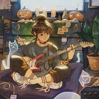 an animated scene of a person sitting on the floor, playing a guitar. They are surrounded by