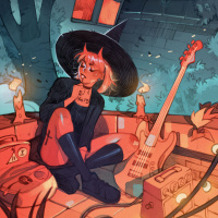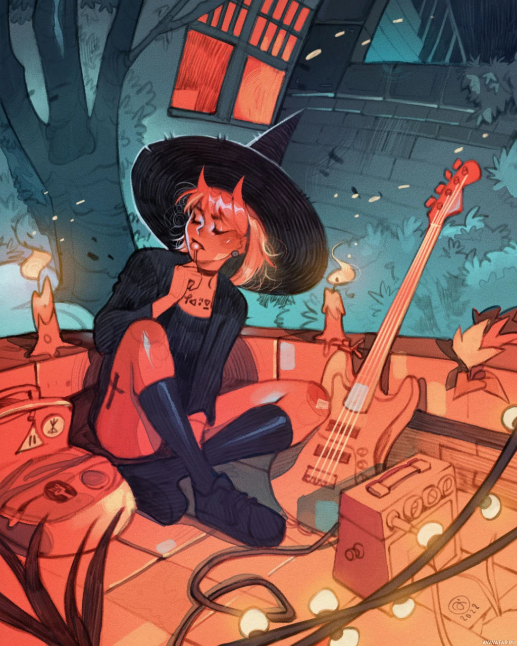 a witch hat and has her eyes closed, suggesting she might be enjoying the sensory experience of being near the waterfall. There's a guitar next to her, indicating that she might be playing or about to play it. The atmosphere seems calm and serene, with