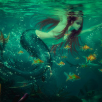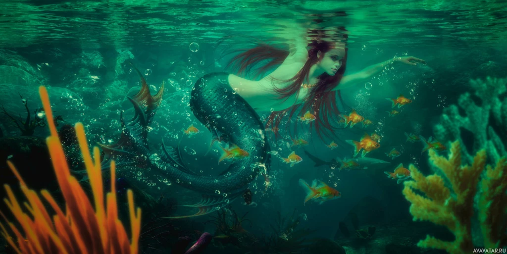 a fantasy scene with an underwater mermaid. The mermaid, which appears to be of the Disney princess type, is surrounded by various