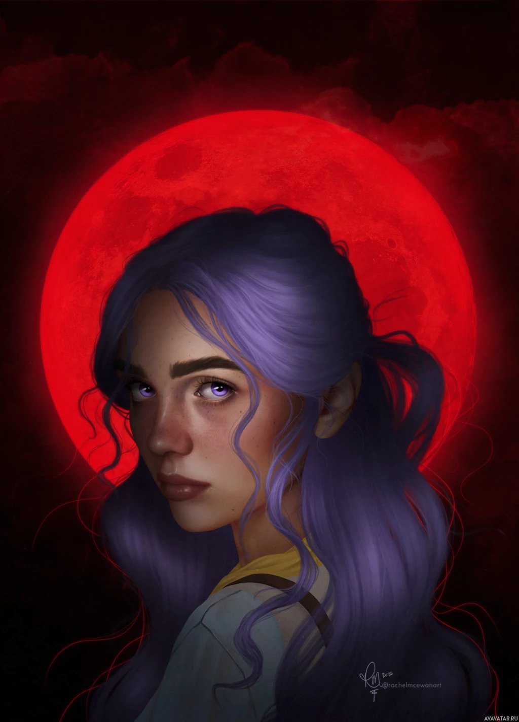 a young girl with purple hair. She has a solemn or contemplative expression, looking slightly away from the viewer. Behind her head is an ominous red moon or celestial body that stands out prominently against