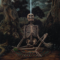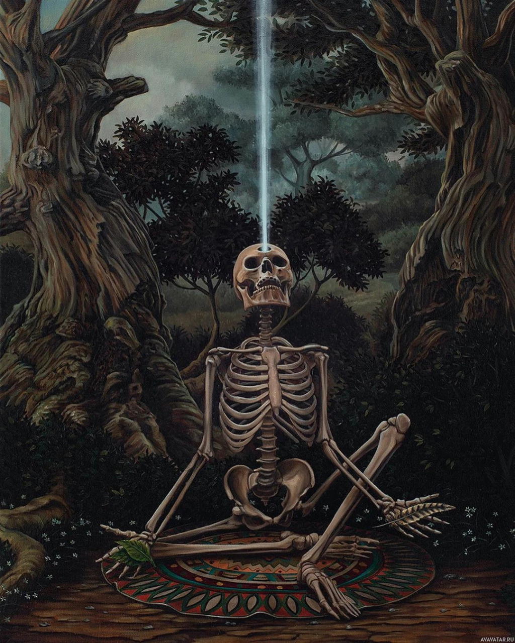 forest scene with lush greenery and trees surrounding the figure. Above the skeleton, there is